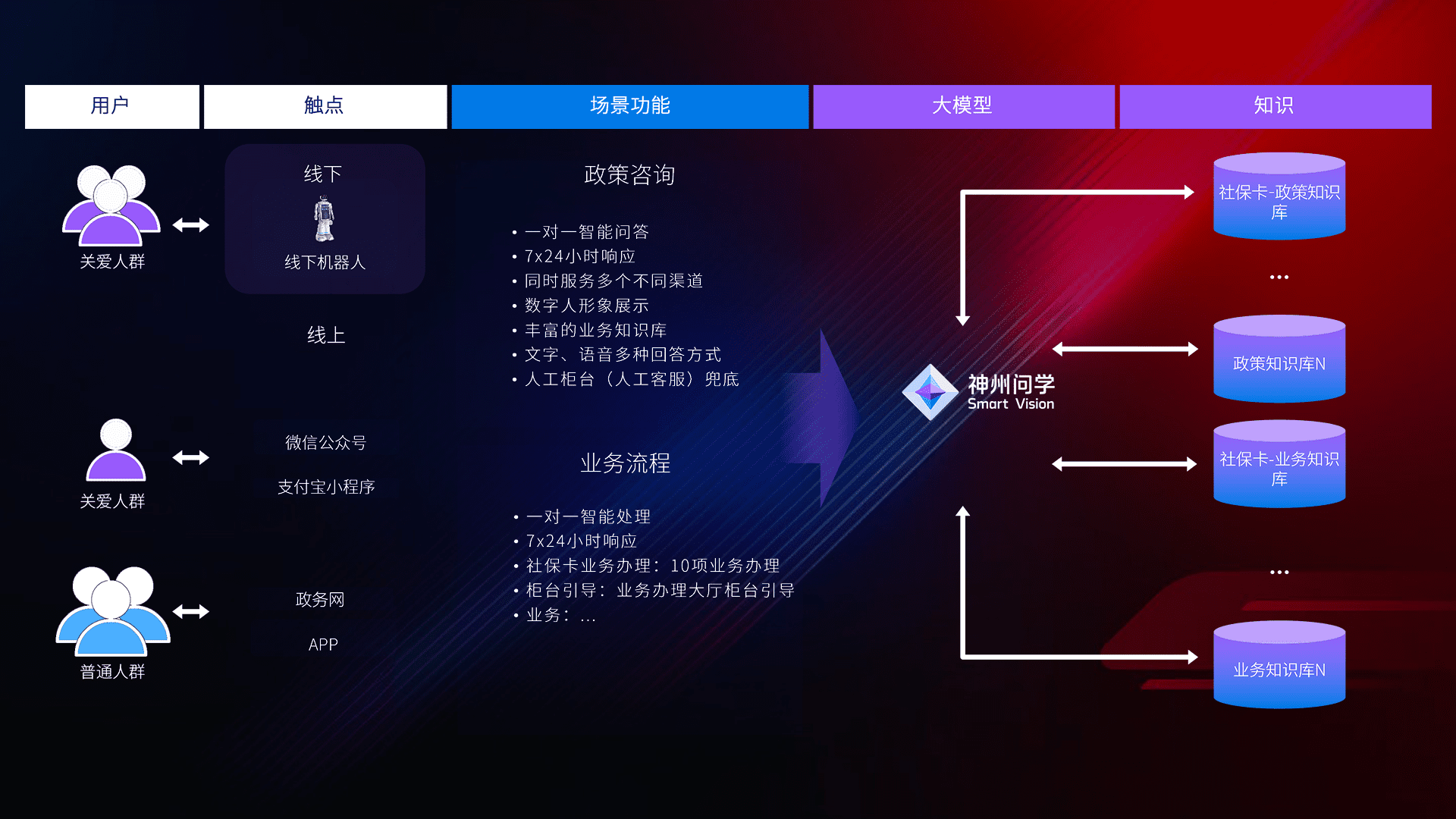 • 线上线下全覆盖:线上提供微信公众号、、、支付宝小程序、、政务网、、app多种渠道,,与线下机器人形成完整服务体系。。