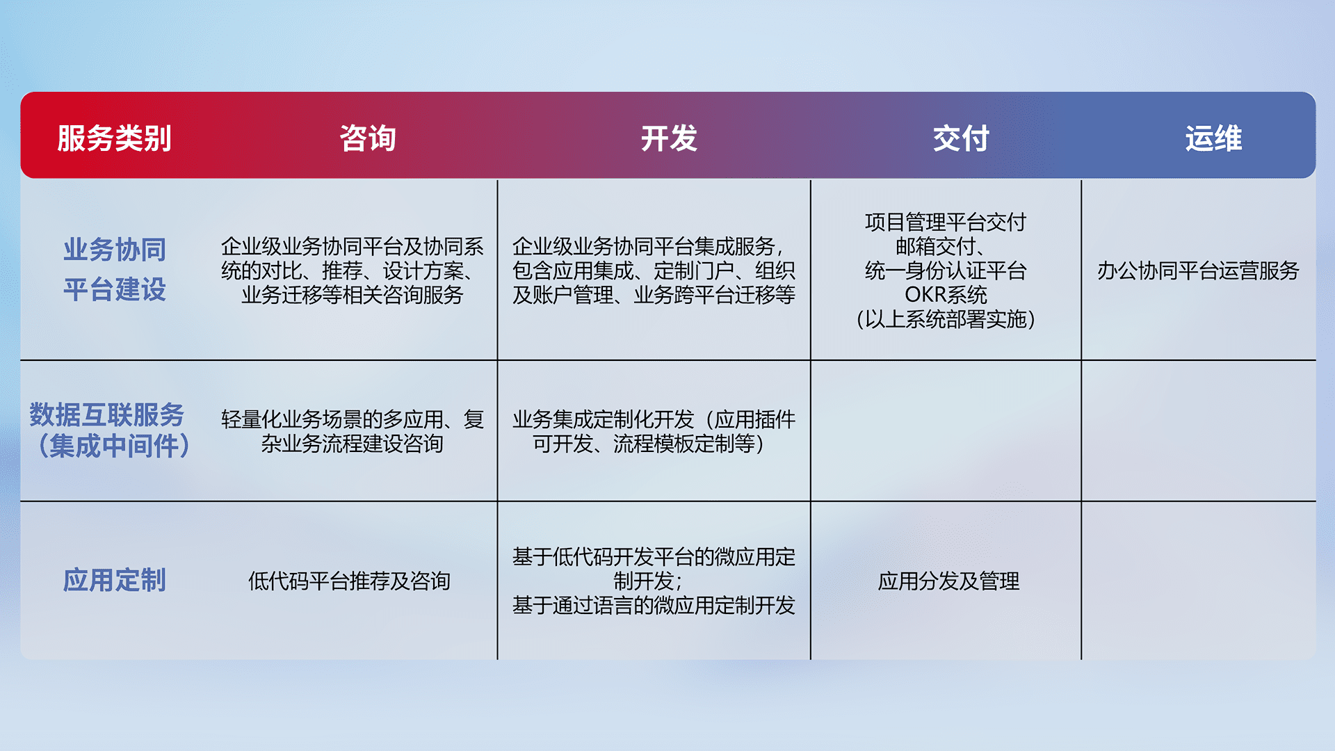针对钉钉、、、、企微、、IDaas等平台级产品提供产品的规划、、、方案、、、交付、、、、定制化开发等服务,,,,实现如统一协同办公、、智能客户服务、、混合会议管理、、、、智能数据查询、、、等业务场景,,,,实现数字化转型。。